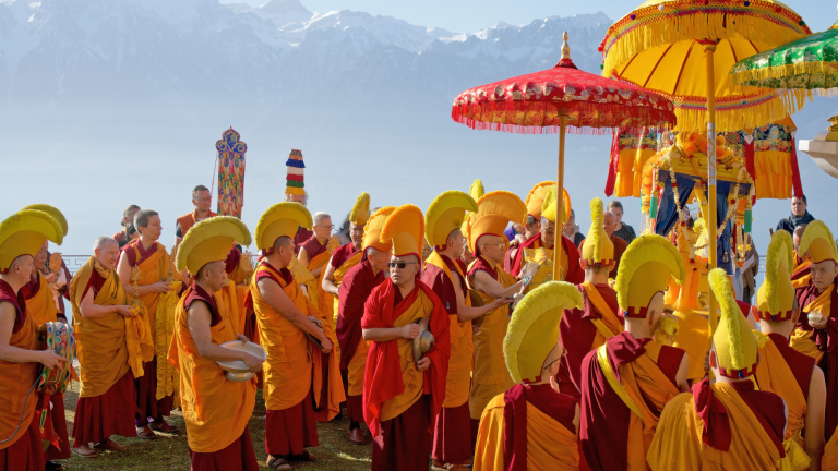 Daarna voeren Zwitserse monniken uit het boeddhistisch hoofdcentrum Rabten Choeling een reeks traditionele Tibetaanse rituelen uit, die gepaard gaan met muziek, kenmerkend voor de Tibetaanse boeddhistische